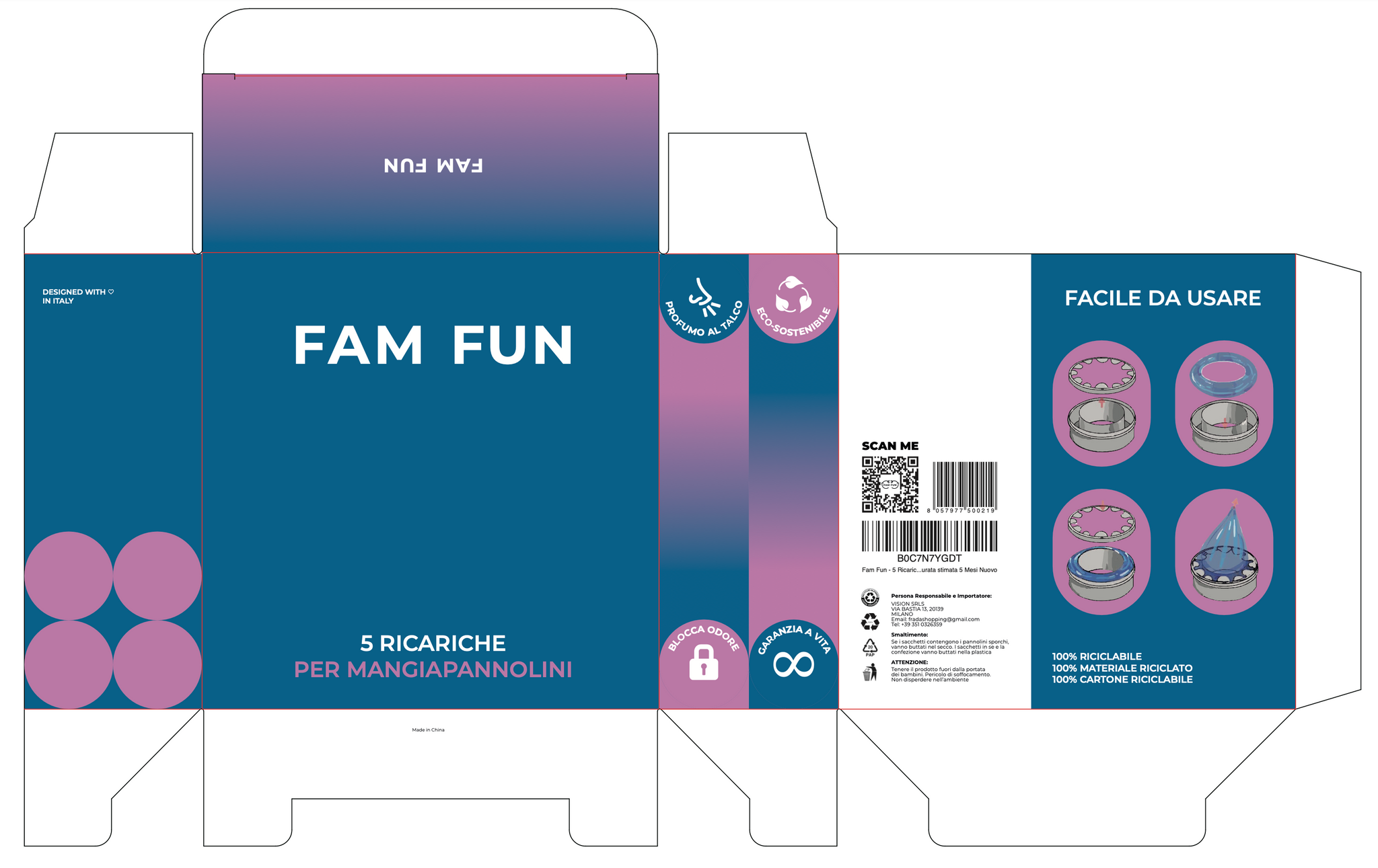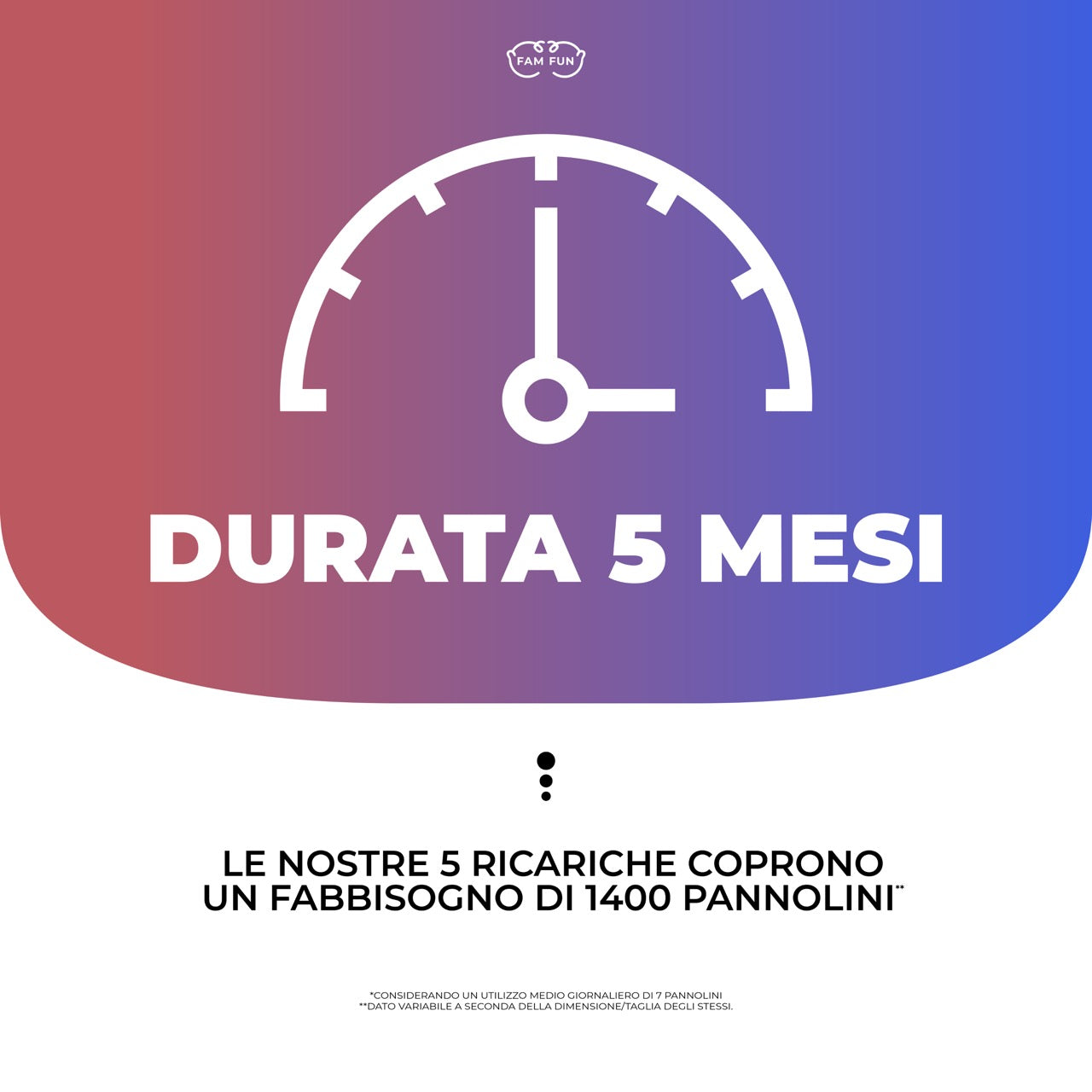 Ogni confezione contiene 5 sacchetti, capaci di contenere fino a 280 pannolini, oltre il 40% in più rispetto alla concorrenza.